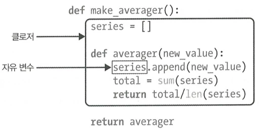 - 클로저는 함수 본체에 정의하지 않고 참조하는 비전역(nonlocal) 변수를 포함한 확장 범위를 가진 함수다.